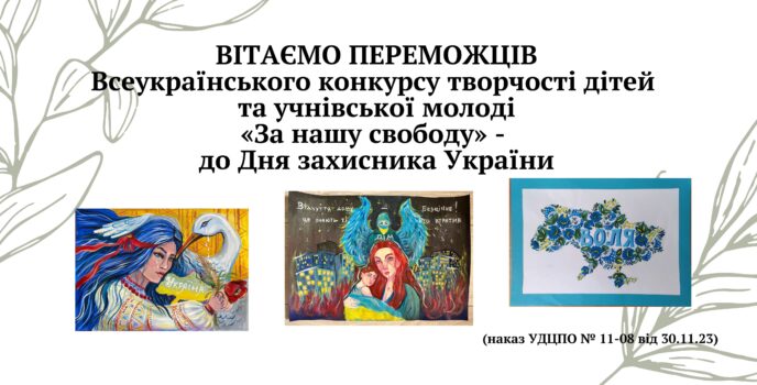 Електронні дипломи розміщені за посиланням ВІТАЄМО ПЕРЕМОЖЦІВ: за зайняте І місце: розділ «Образотворче мистецтво»: • Боярчук Діану, вихованку гуртка «Декор» комунального закладу загальної середньої освіти «Княгининівський ліцей № 34 Луцької міської ради» Волинської області, за роботу «Надійні руки України», керівник Білінець Єва Степанівна; • Панасюк Аліну, вихованку зразкової студії образотворчого мистецтва «Олівець-малювець» Будинку дитячої та …
